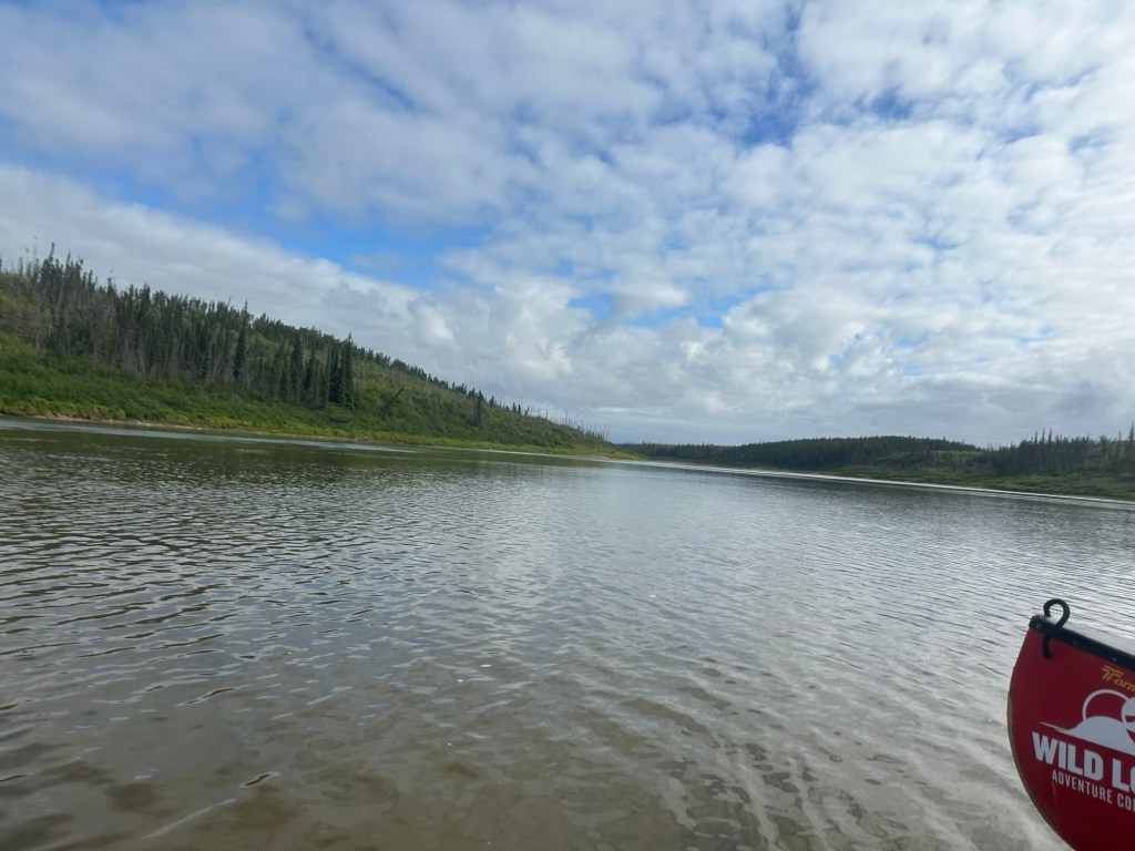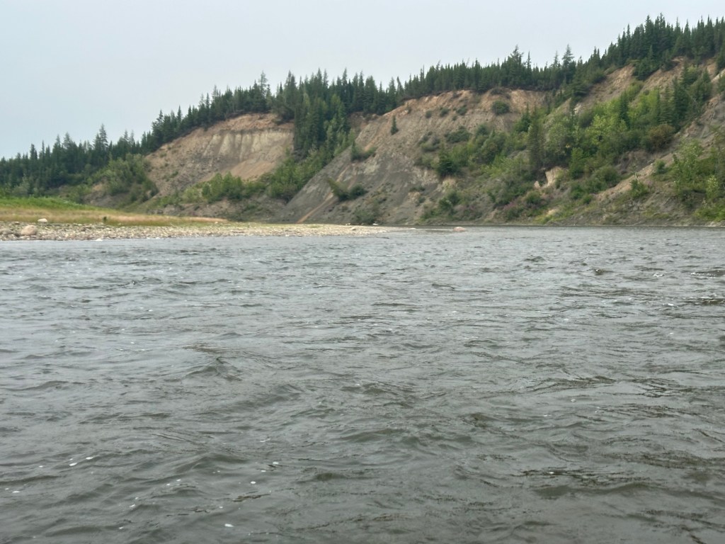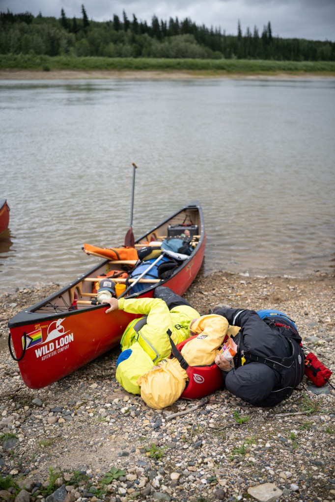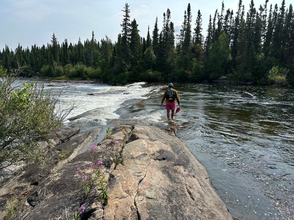 Our boat continued on the Nelson River albeit calmer than the Hudson Bay, but still pewter cold. Our guide, Garrett, spotted the van backed down a hill waiting for us. Our pilot cut the boat’s engine and in short order we were handing our canoes and gear down, boarding the canoes and paddling over and around boulders.