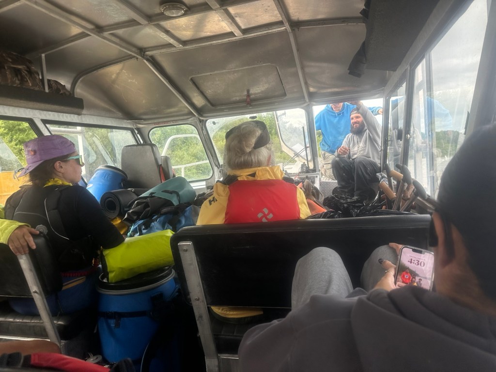 The boat is spotted. It only takes 20 minutes to load the boat with 11 people, four canoes and all our gear.