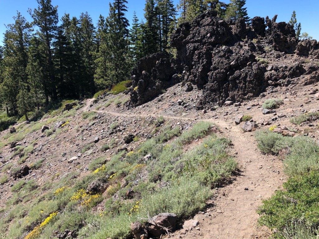 The morning was picturesque. I moved from mule’s ears to volcanic formations. From no apparent crawlers to lizards. After a couple of hours, without seeing a human, Stack came walking my way. They (this pronoun is not used as plural, but rather as gender-neutral) told me about a poor night’s sleep in the hammock because they forgot an important attachment for the hammock’s stability. So it goes..