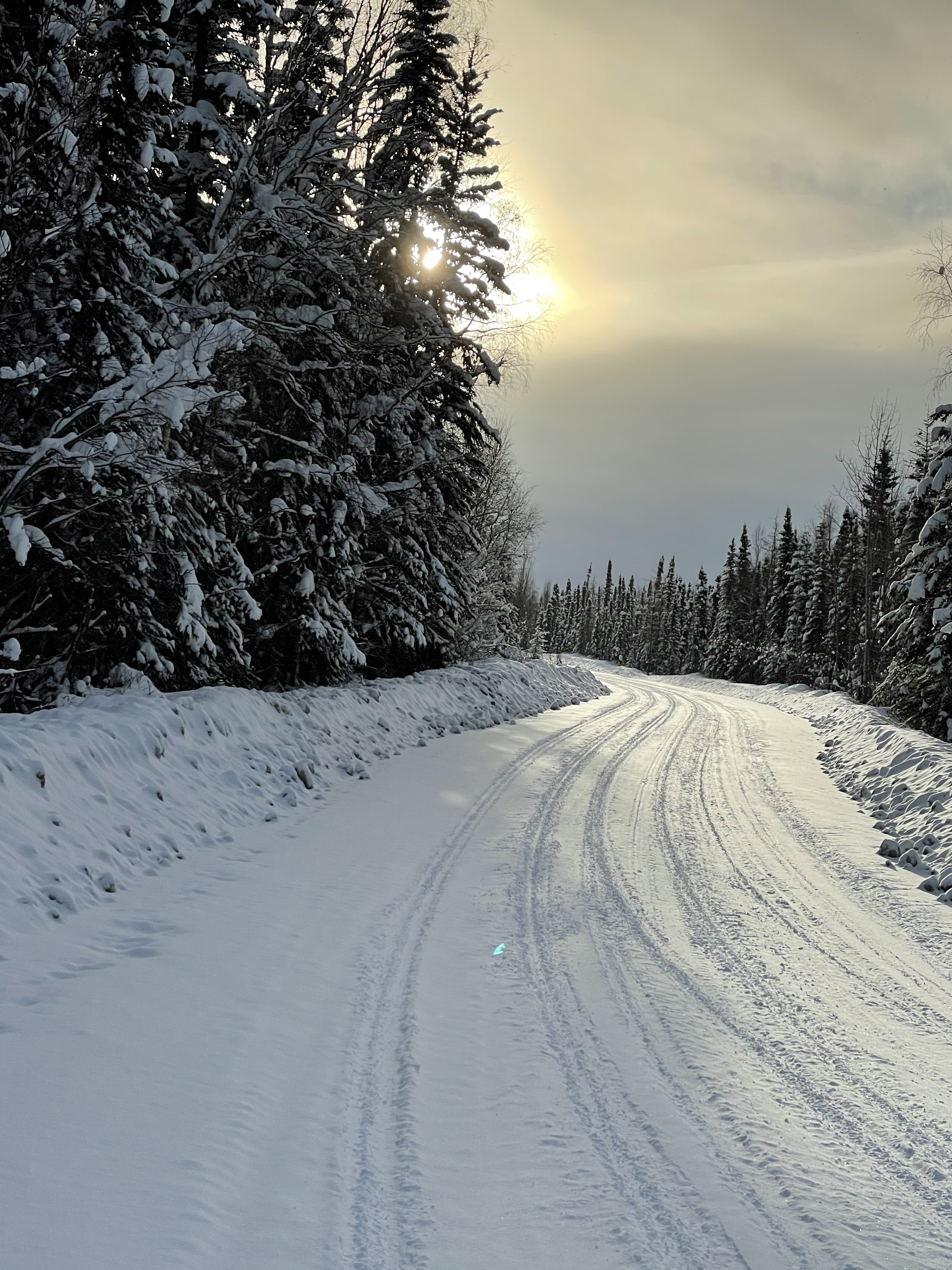 The day was warm hovering just below zero. The clouds made it look colder. I spotted a Gray Jay, Boreal Chickadees, Dark-eyes Juncos, Hoary Redpolls and Ravens swooping and tumbling above the taiga . I ran out the road three miles. It was a joy to experience such silence only cracked by the cries of the Raven. The untrampled snow for my untrammeled spirit. The sun suddenly broke free.