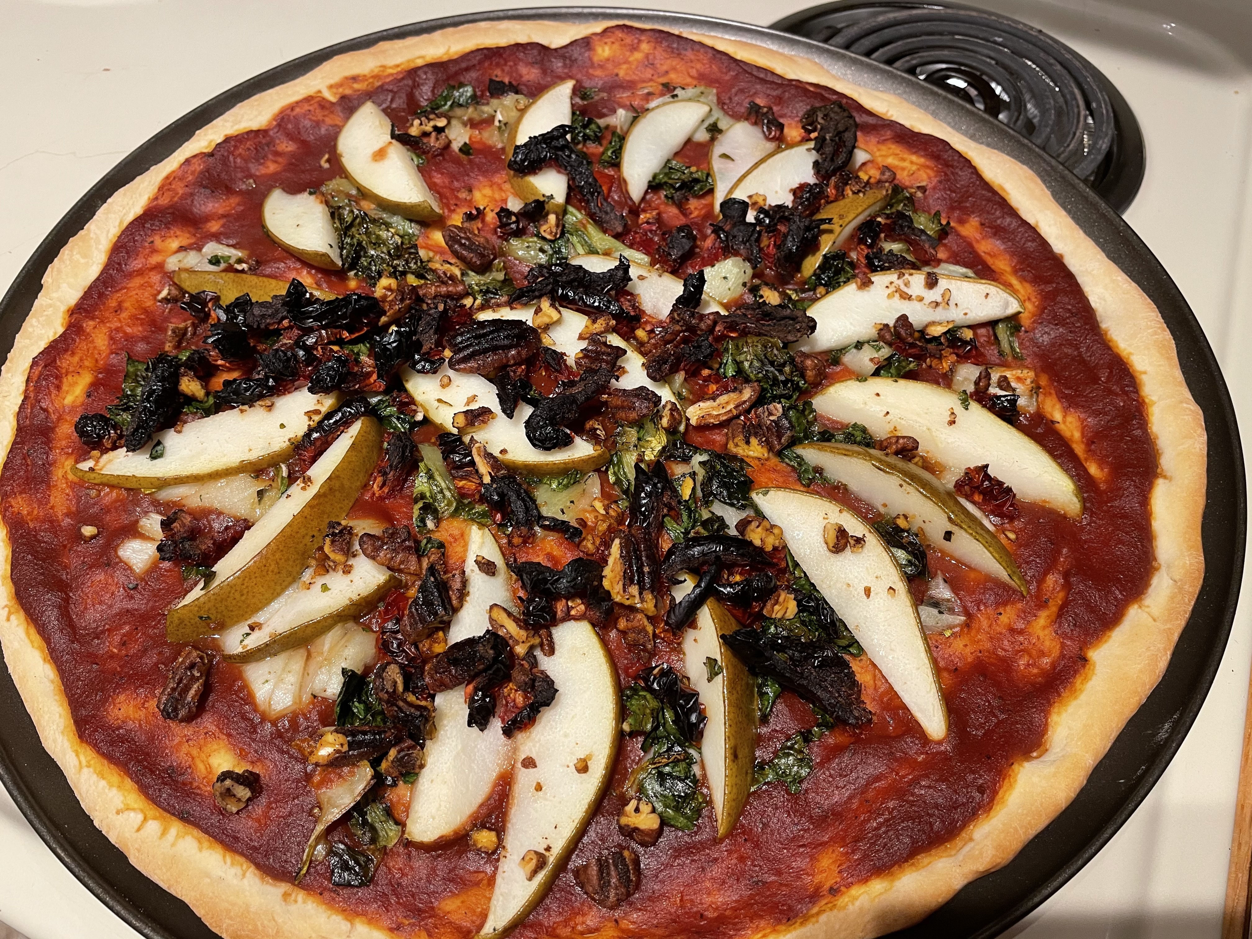 This is my dinner for four nights made from what I had. Home made crust, tomato sauce, kale, Bok Choy, pear and nuts. Who needs cheese?