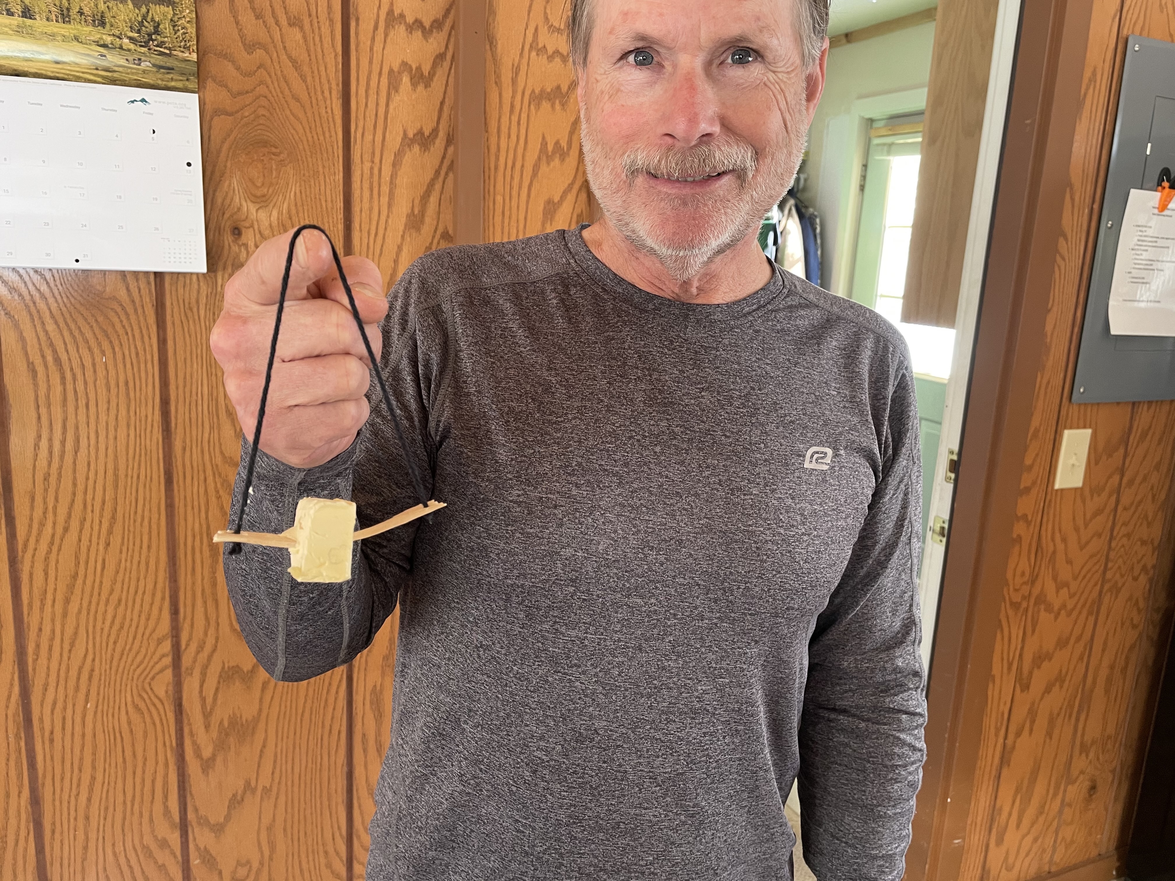 Back to our lovely time in McGrathland. Today I challenged my engineer husband to make something practical and brilliant from a piece of string, a wood chip and a stick of margarines. Here it is. Brilliant.