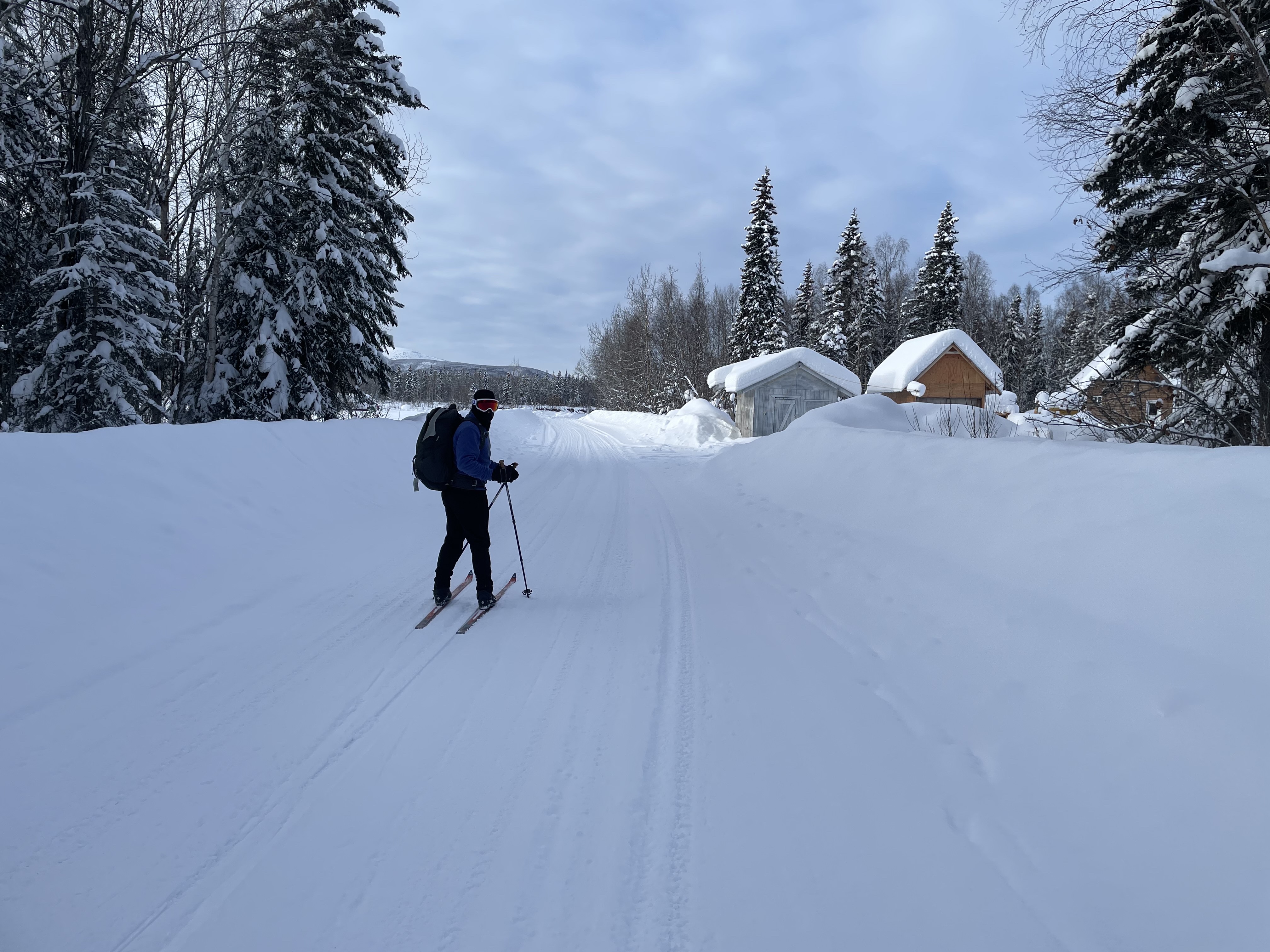What a difference direction makes. Going out of town on this 1 degree day was pleasant enough, but apparently we had a 2 mph tailwind. Not much you say, however walking at 3 mph into a 2 mph headwind makes it feel 5 degrees colder. We were lucky that wind wasn’t 7 mph, because then you would be feeling 21 degrees colder. This is my explanation for returning twice to the cabin today for extra clothing. Deb, after being here a month already, correctly dressed the first time.
