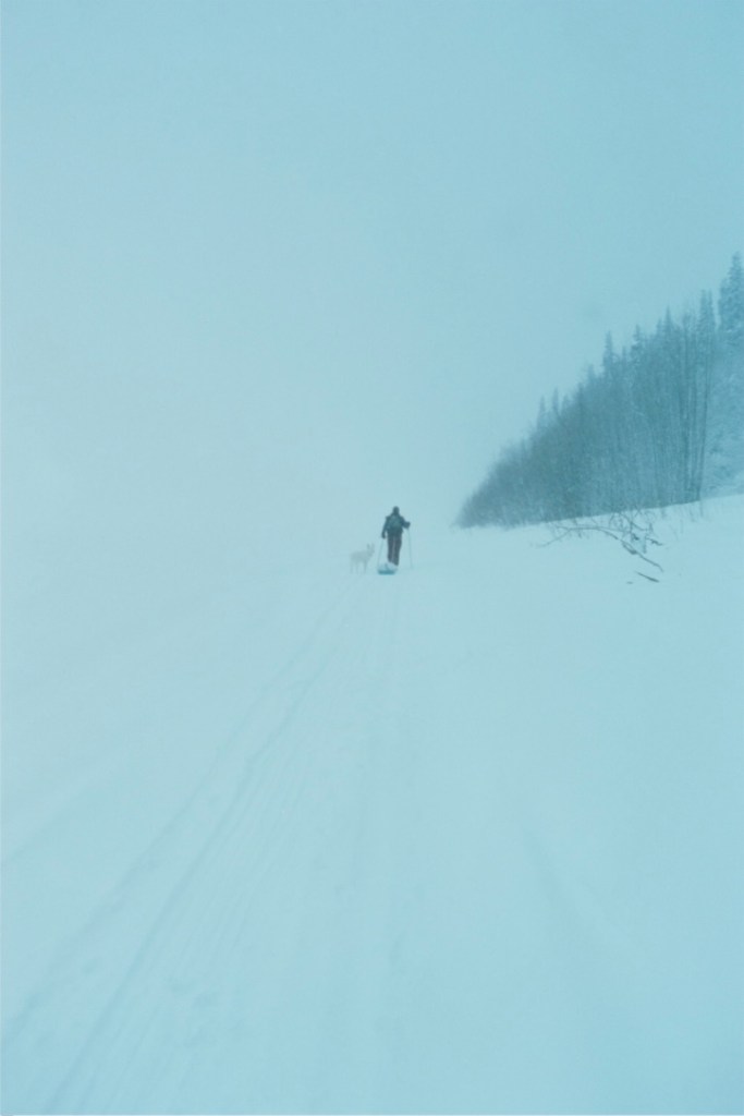 Our first landmark was a bluff 8 miles out from Grayling called Jonah’s nose (Is it Biblical?).  The snow was still blowing, and we were totally alone breaking trail, but we seemed to reach the bluff in no time.  By mile 14, however, I was really started to tire, plus, I could feel the blisters forming on my heels.  Every time we’d stop for even a minute to adjust things, Muk would walk around in concentric circles, kind of stamping his feet as he went.  We thought he was trying to spell SOS in the snow, but soon realized that he was making a bed.  He could burrow down and be tight in a sleeping ball in less than 30 seconds.  But as soon as we started anew, he’d jump up and plod onward.