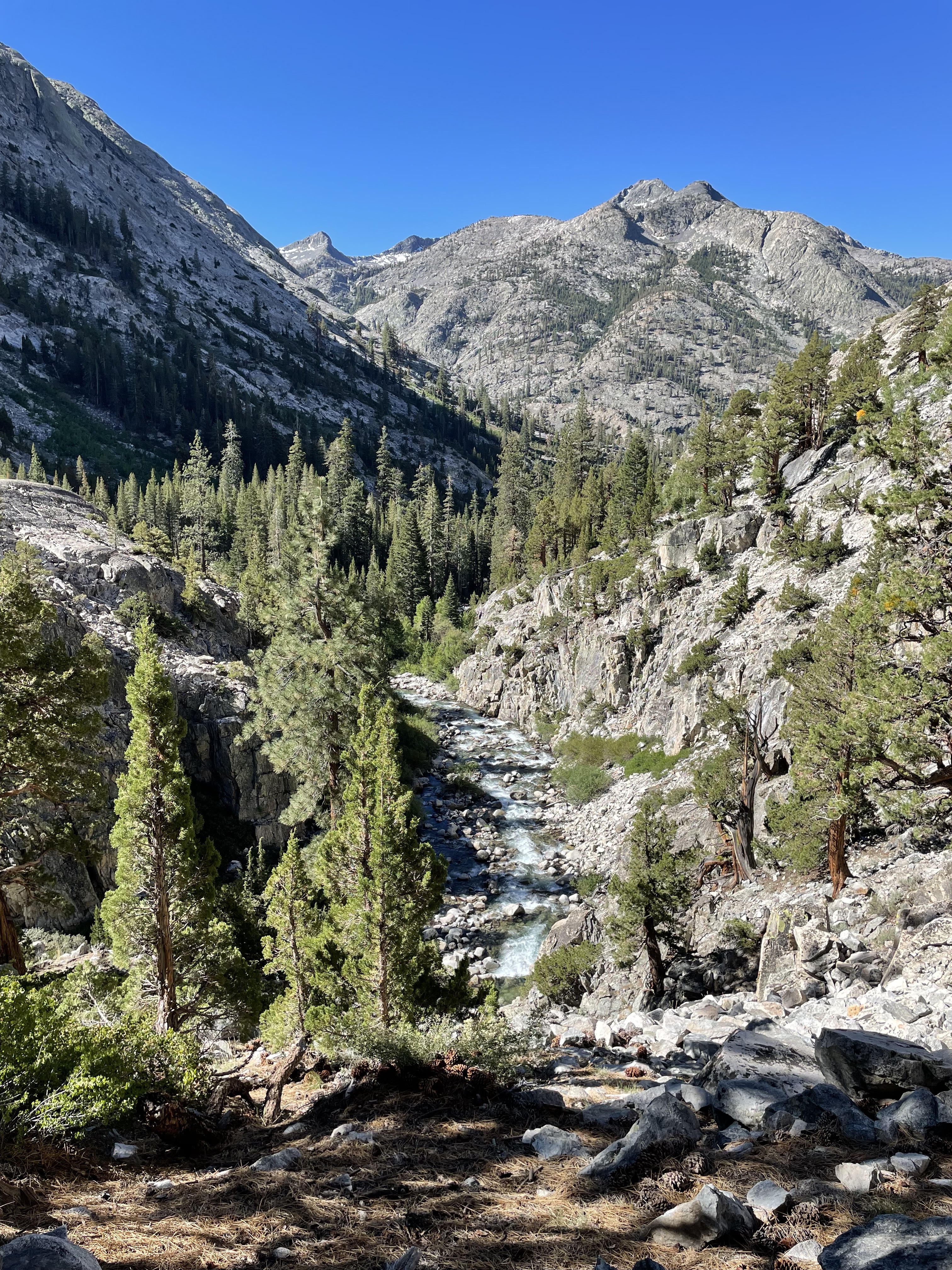 Our trail started to ascend. We were leaving the water far below. The trail turned rocky, and the pine trees reappeared. We entered Piute Canyon. We remained unsure where the next water source would be. We were also unsure about how the reported “Pine Creek Pass” would impact us. We weren’t going over it, but would we have some switchbacks? Also, we needed to be on the other side of the creek, which was huge and roaring.