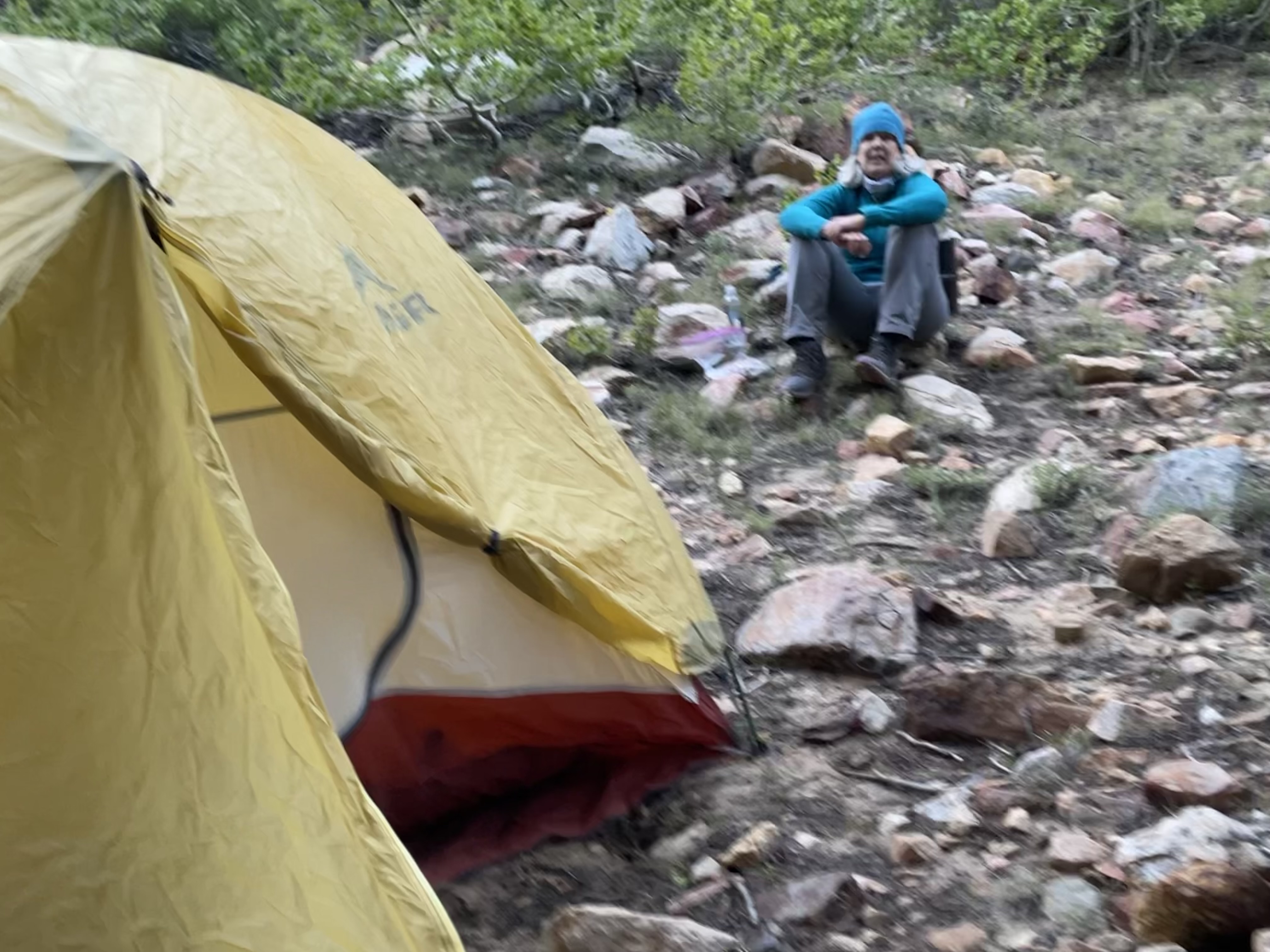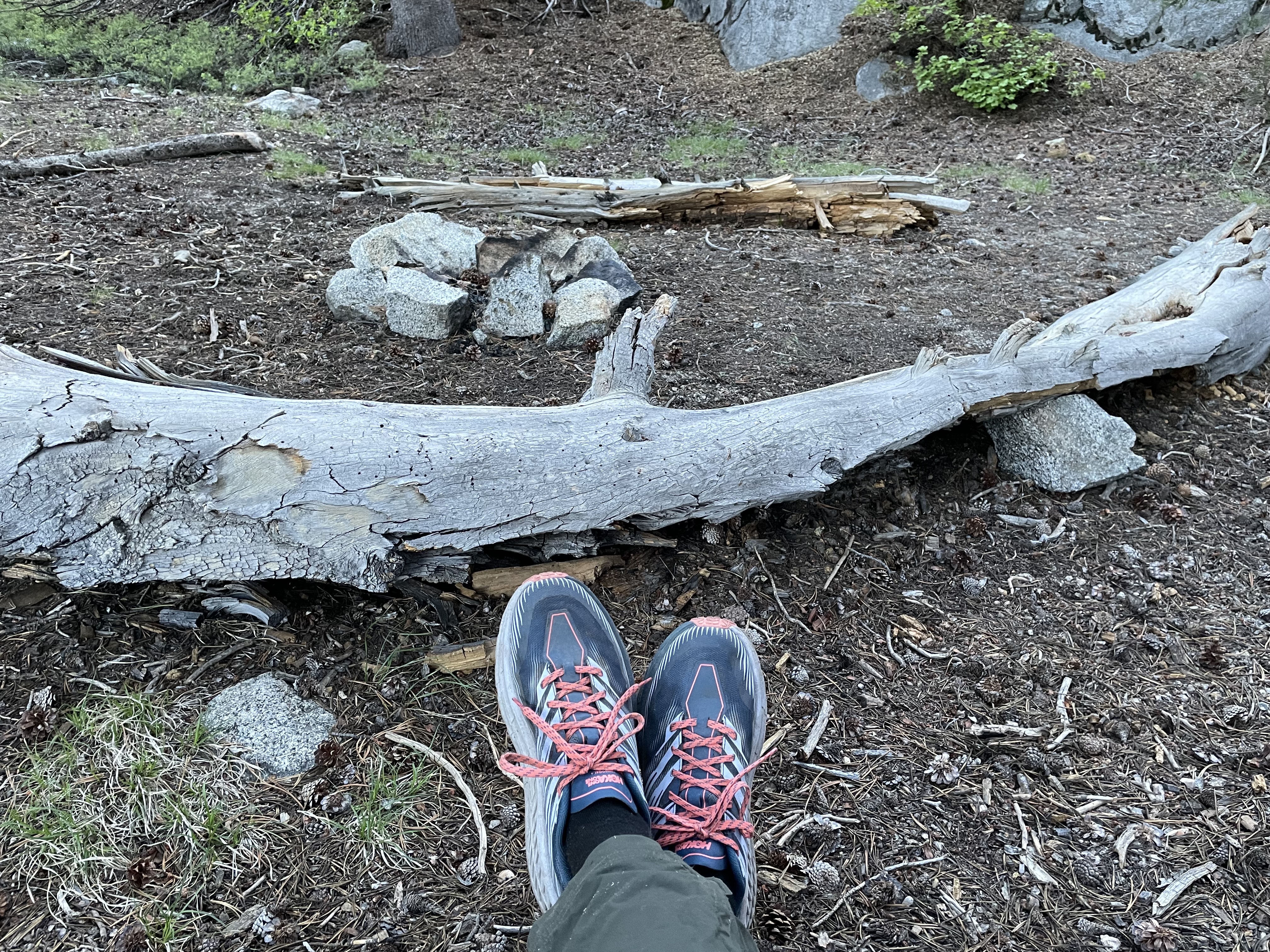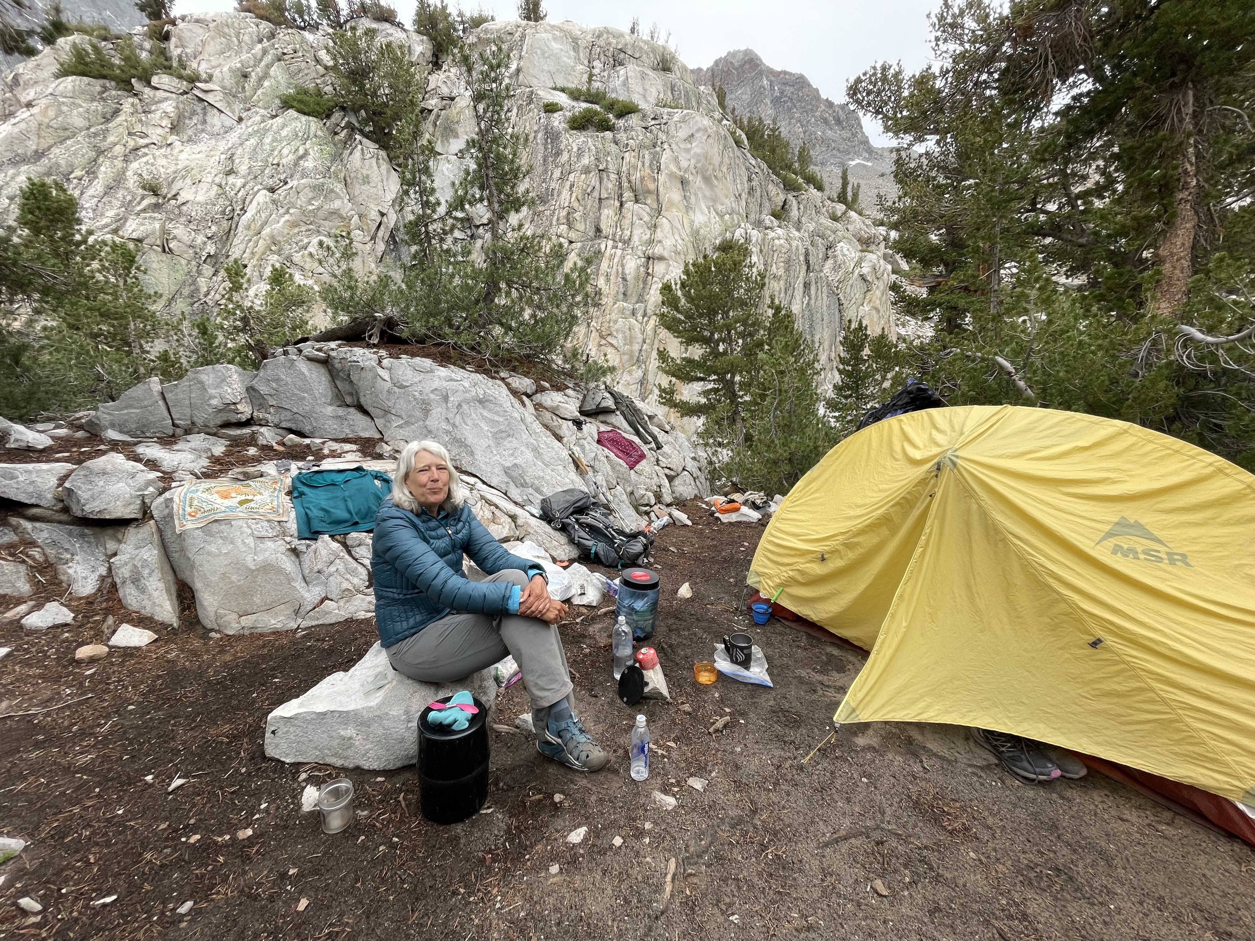 The clouds started billowing up and tinging dark. We checked our raingear and concluded it was paltry. If we proceeded, we’d get soaked. It started spitting just as we came upon a camp with many possible sites. It was empty and Robin picked the perfect site under some tree branches. In short time, we were joined by six or seven or ten, who knows, PCT hikers. The rain seemed quelled.Our tent neighbor had joined his daughter for a two-week stint on her PCT journey. When I found out he was a Trust Attorney, I asked if I could ask him some questions. He pulled up a rock and said he’d give me a consultation. Then, to make sure I’d remember his words, he made a transcript on my phone. Trail magic at the end of the day.