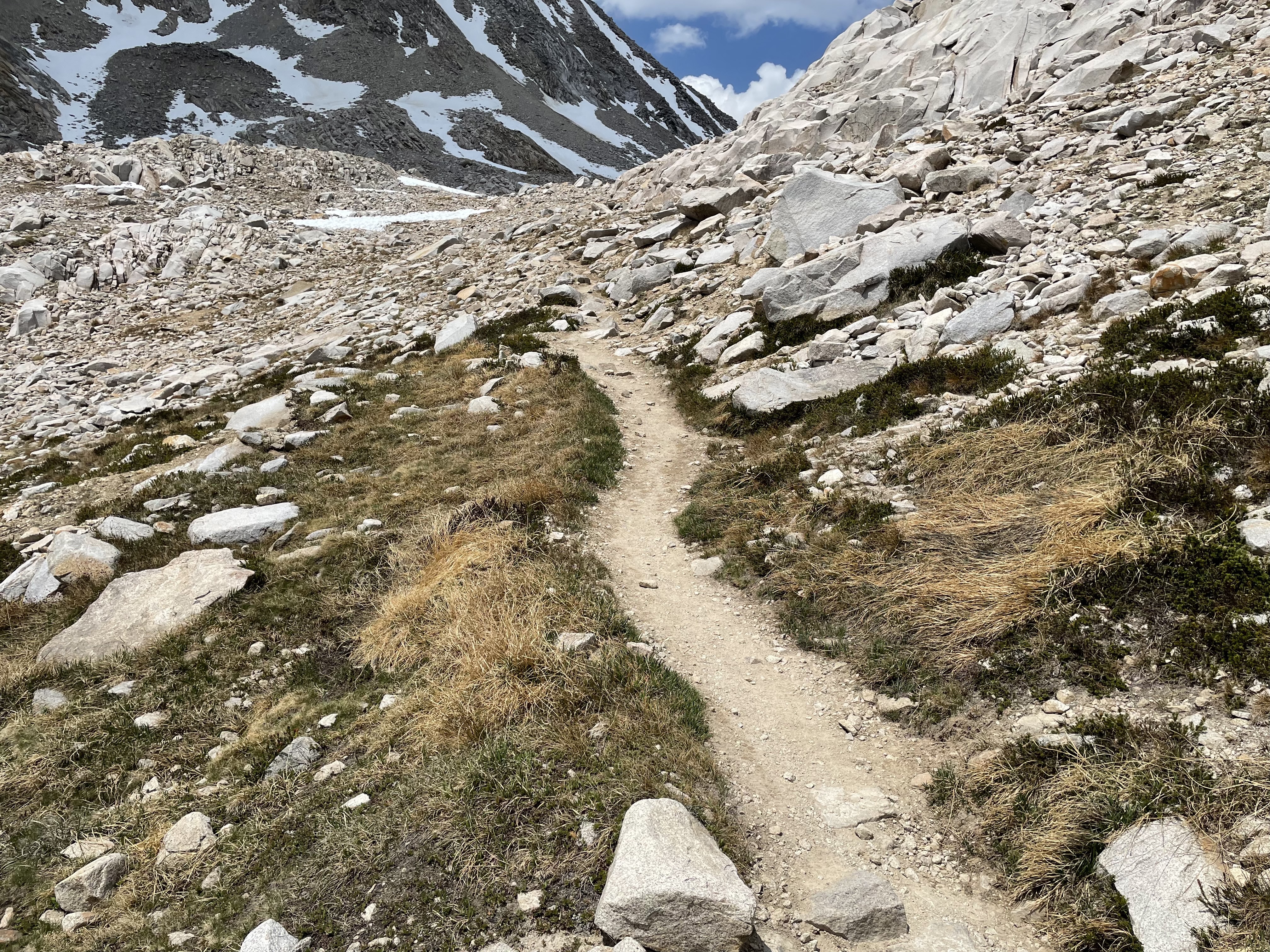 After nine hours of sleep, I was surprised. How did I sleep so long? I lay until 5:00 am assessing my condition. What should I expect out of this day? Can we make it at our current pace? We don’t know the exact mileage for this hike. We had seen both 53 miles, and 59 miles listed for this trek. It would turn out to be 61 miles for us. Naturally, estimation will play a part in our daily expectations. Prior to our start, we had batted around the idea of twelve miles per day. That would get us there in five days. That seemed a bit out of our range. We were predicting 6 or 7 days. Seven days would put us at an 8.7 mile per day pace, and six would put us at a 10 mile per day pace. Our permit was good until June 21st. If we used all that time, we would run out of food. So, I felt a need to evaluate our pace. I figured we’d get faster as we went along, however my uphill speed was slow and I figured with Muir and Bishop passes ahead, they would slow me.