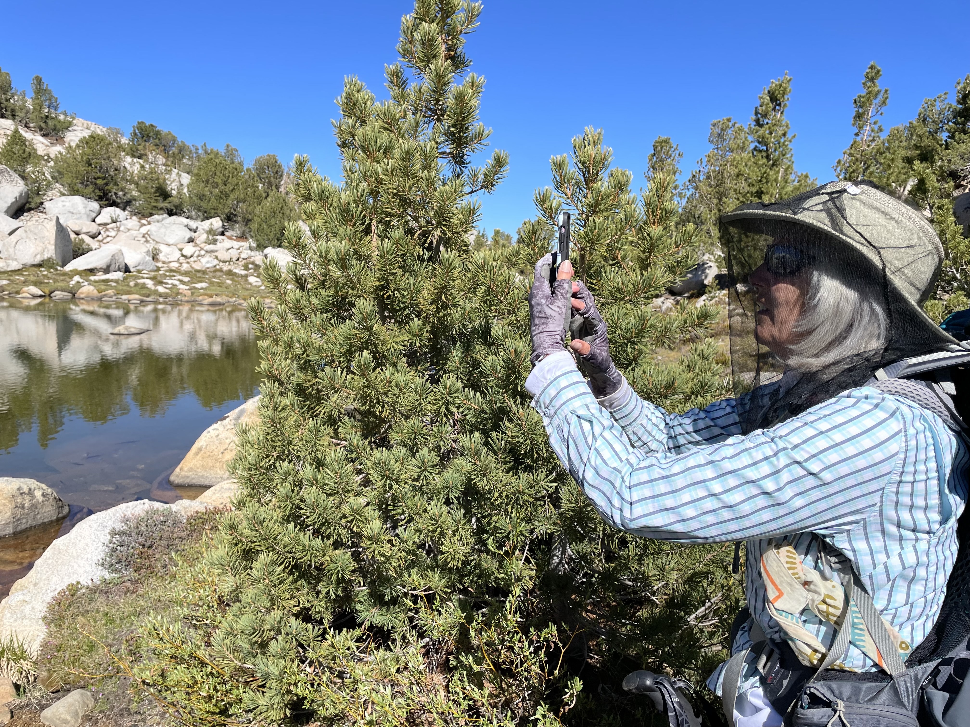 Thank God, Paul, Robin’s husband, had loaded the Gaia app on her phone. And even though he failed to give her any training, she patiently poked around on the app until she felt fairly confident she could lead us in the right direction. This wasdefinitely the road less traveled by, so that app made all the difference. This piddly trail did not resemble the highway of a trail on the east side of the pass, so she had to do plenty of deciphering. She was spot on. The entire view that lay before us was wide open granite boulders and benches only lightlypeppered with stands of brush. Luckily, rivers and lakes were plentiful.