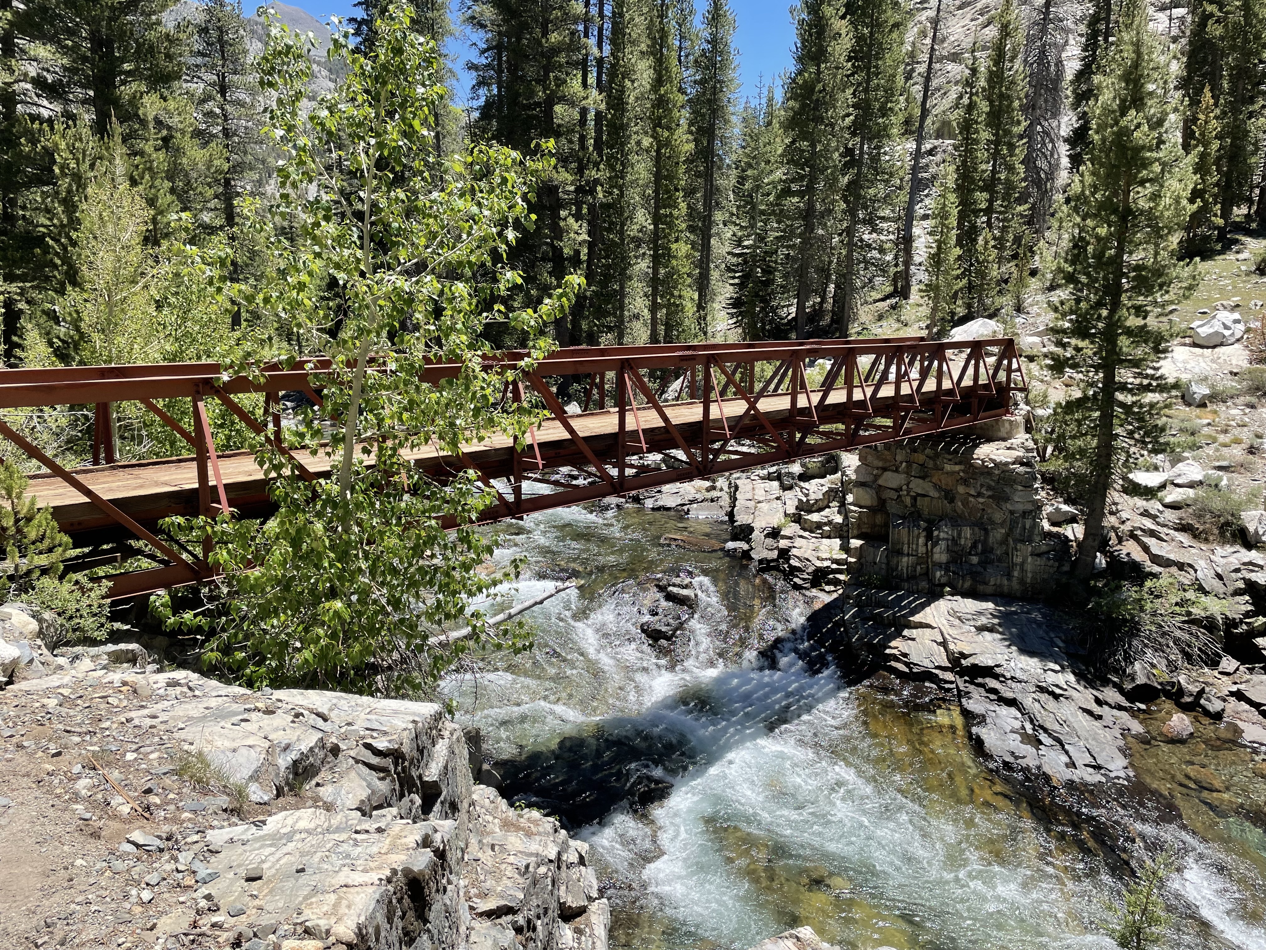 The looming of crossing that roaring creek, a river really, was a haunting menace. We knew we must get on the other side. We hiked higher over rocks, big ones, often rolling them unexpectedly. We were almost exhausted of water. All this uncertainty plagued us. Until I turned a corner and there it was: A Bridge. The most exquisite bridge. Cheers. Our trail ended and we walked over raging waters on our first bridge on the John Muir Trail, JMT. Accessible water awaited us. The terrain seemed almost flat. And real camps with totally flat tent sites were along the waterside. We chose a beautiful four site camp to ourselves.