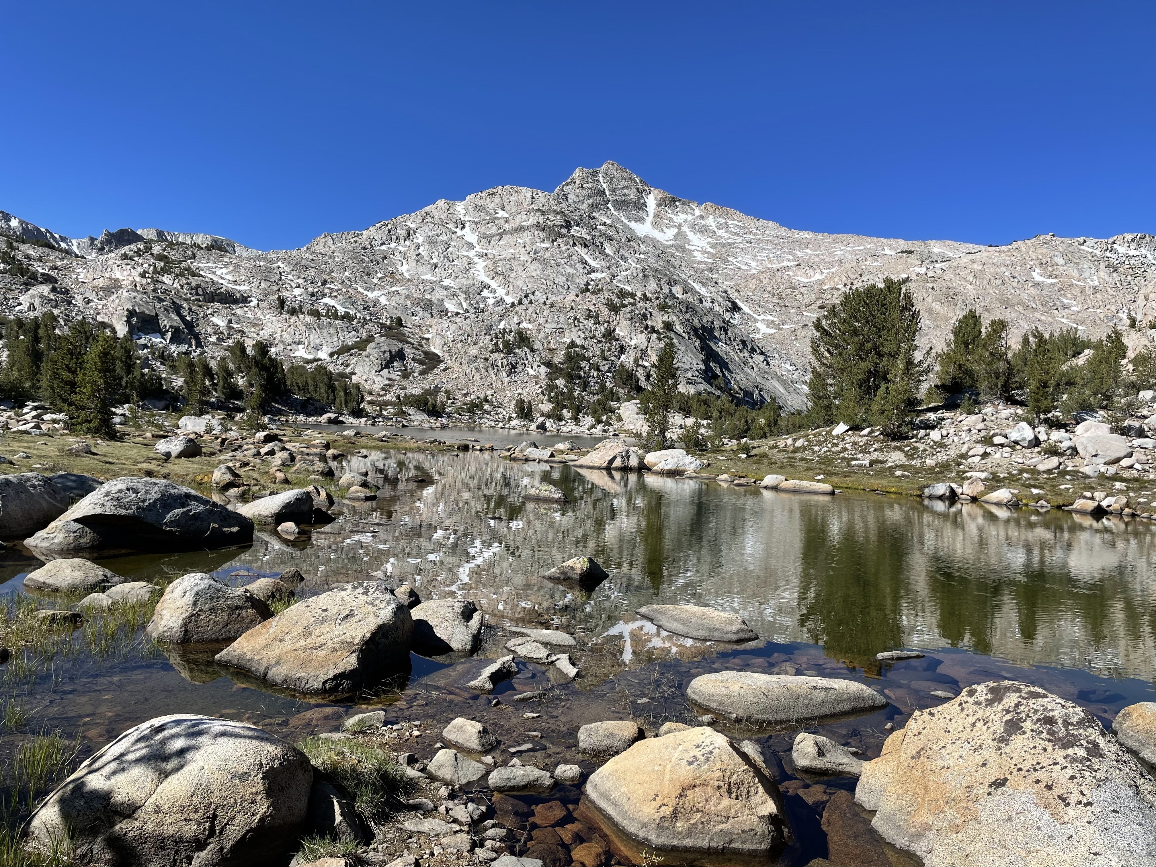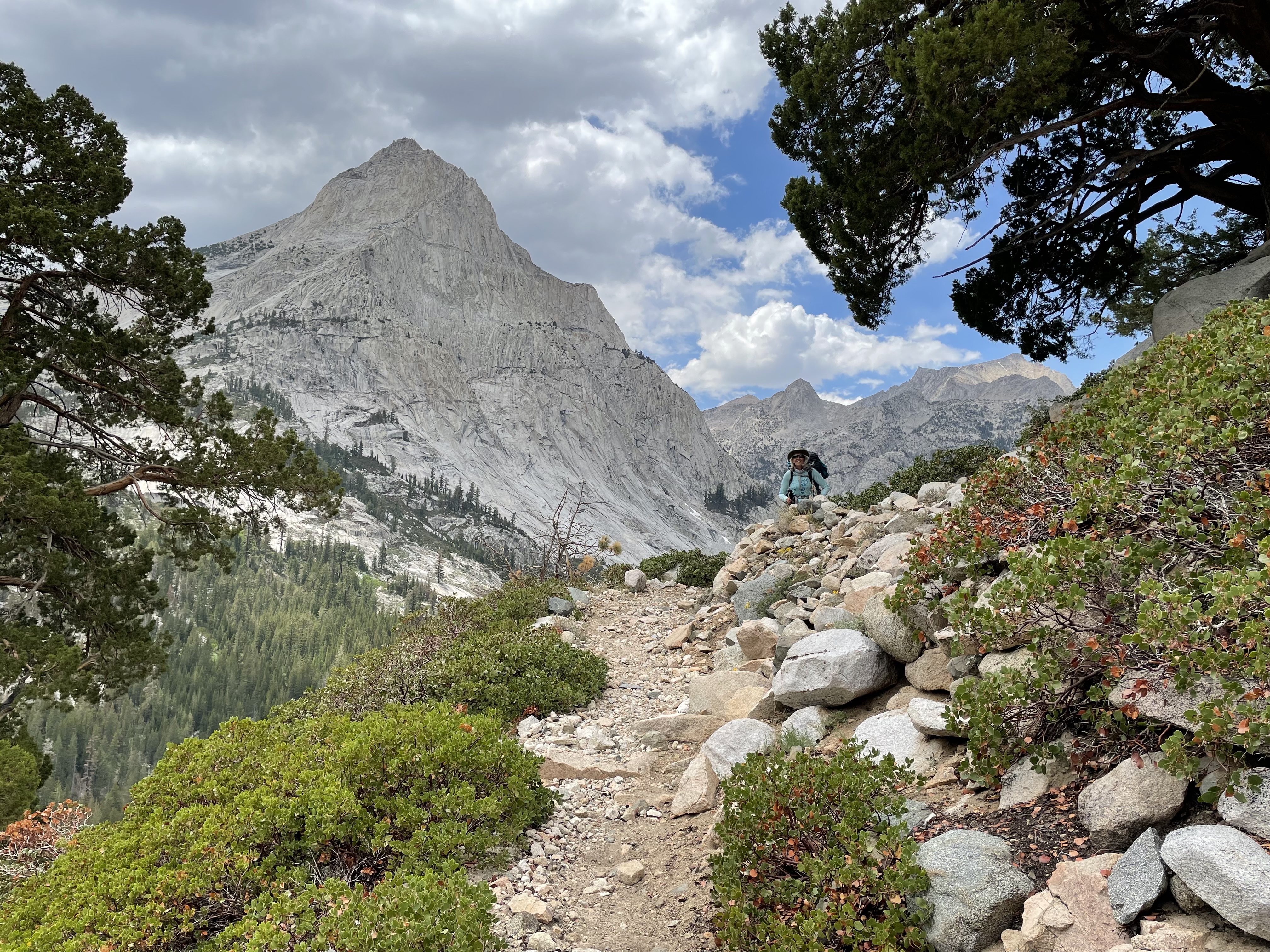 We continued downhill on moderate terrain. At a small creek a guy was squeezing water through his Sawyer. I ask how far we were from the hordes of mosquitoes we had been hearing about. He said the distance was zero. I stood unfazed by bites and truly amazed because mosquitoes always love me. We, too, needed to filter water, but decided to get closer to our turn-off on the Bishop Pass trail which came up a little quicker than we expected. We had questions about a good place to camp. We were heading from a low spot of 8,750 feet out of the canyon, into two major squiggles on the map indicating switchbacks and major uphill.