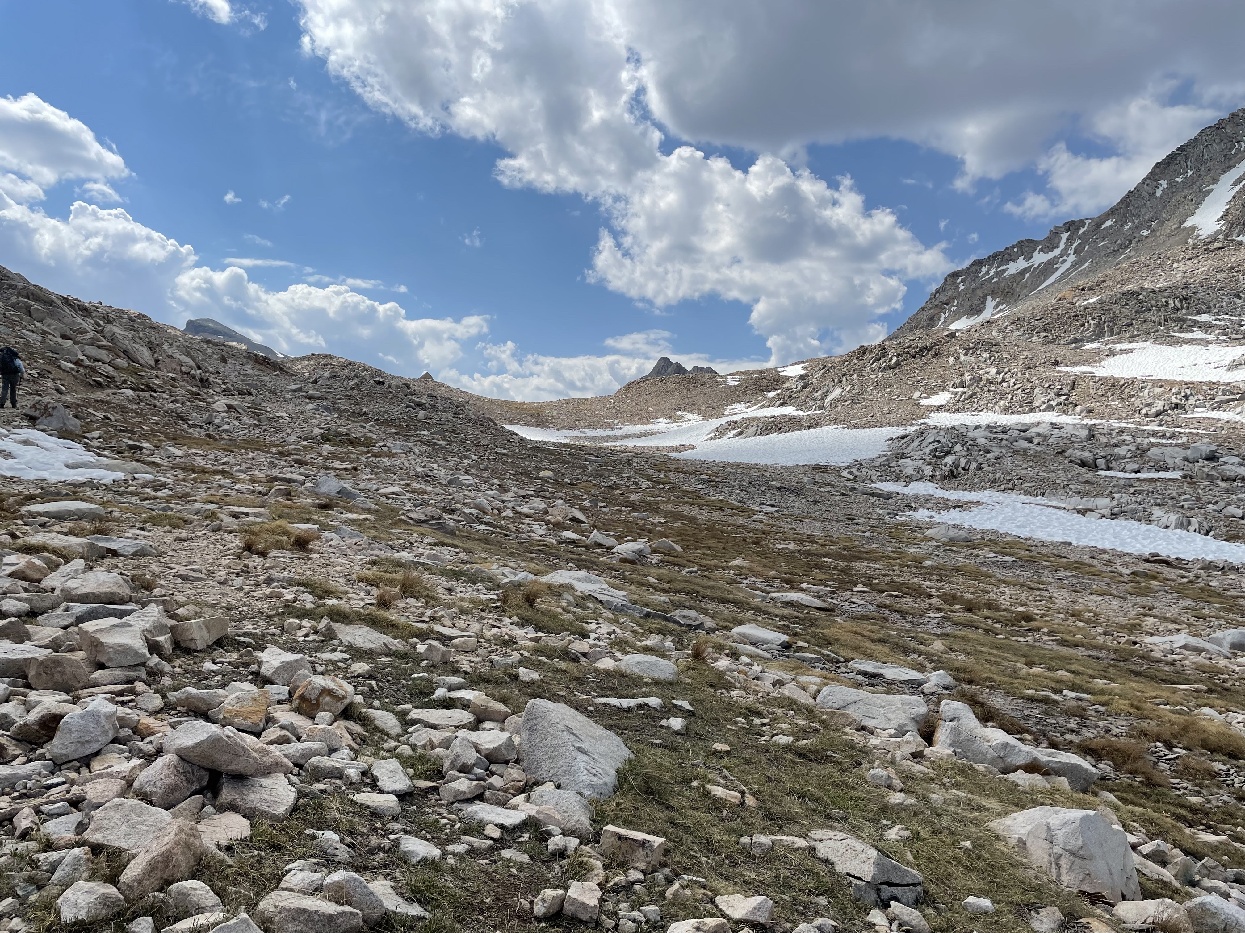 We left the trees behind at Evolution Lake. Our landscape was high elevation granite dotted with lakes and covered in rock rubble. From back at the Evolution Creek crossing, at elevation 8,486 feet, and at 15 miles from Muir Pass, we had climbed two switchback sectionsand hiked upward continuously. From Wanda Lake, we only had 1.2 miles and a gain of 465 feet to arrive at Muir Pass elevation 11,991 feet.