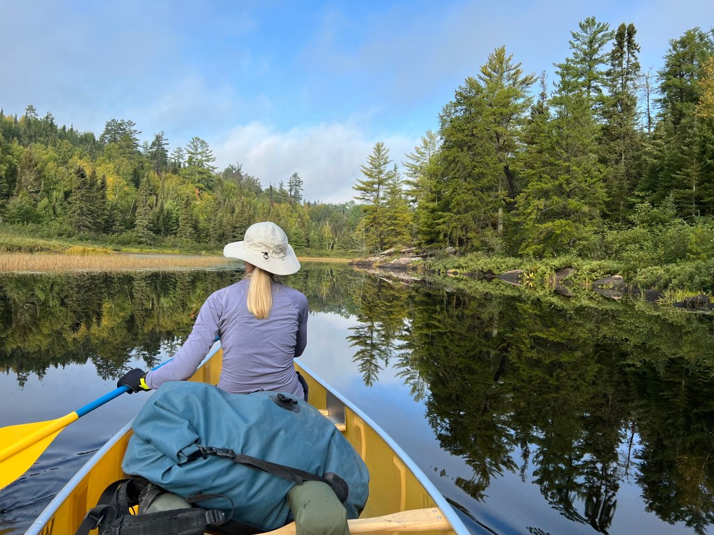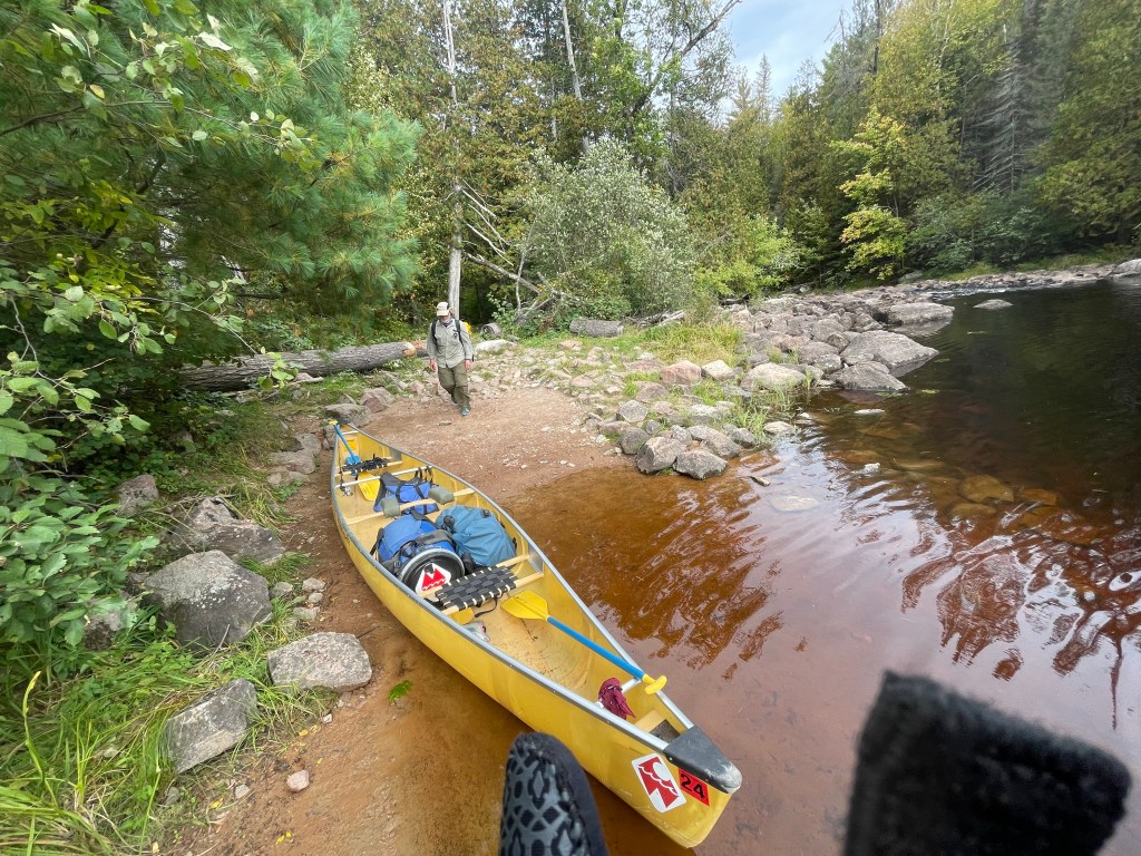 The portage was long enough for us to realize our fatal mistake. We forgot that all of our ultra lite backpacking practices apply to canoe trips too. Last year I used my backpack. Which is light filled with light gear. And it fits distributing the weight between shoulders and hips. Terry left his backpack home because he worried about his gear getting wet, he rented a huge dry bag. Along with being cumbersome, it was a tall dark hole that pulled our gear to the bottom of the bag. Retrieving items from inside was backbreaking. It allowed you to bring more stuff, but that’s just what you don’t want to do.
