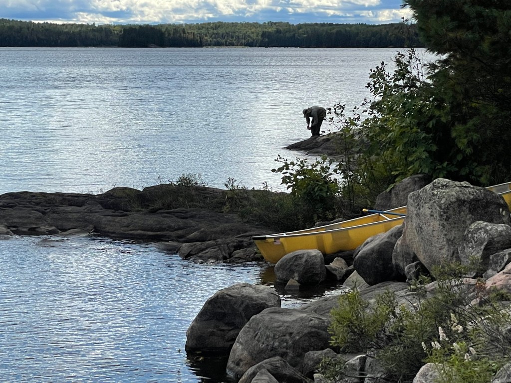 The winds were picking up as we crossed the chop to find another camp. We saw two canoes lashed together with two men in each trolling. Terry asked if they were the inhabitants of the primo campsite. They admitted to returning every year to that same place just for fishing. They didn’t look particularly robust, so they probably didn’t arrive under their own power. They invited us to visit them, so hopefully we’ll visit and fish for more information.