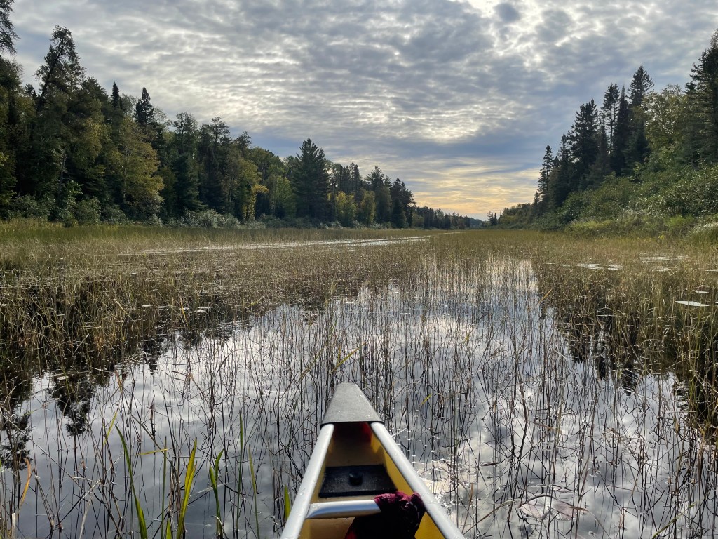 The paddle starts as a narrow channel of knocked down reeds in the middle of a pond of reeds. So this is pond. But it opens into what looks like a small lake. So this is a pond too. We’re looking for the next portage 73. This will allow us to reach North and South Lakes both because they’re connected. In this vast wilderness there are no signs anywhere. You know the approximate location of lakes, campsites and portages by reading a map.