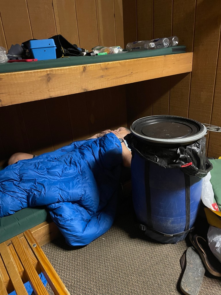 Terry asleep in our bunk room at the outfitters after hours of packing gear.