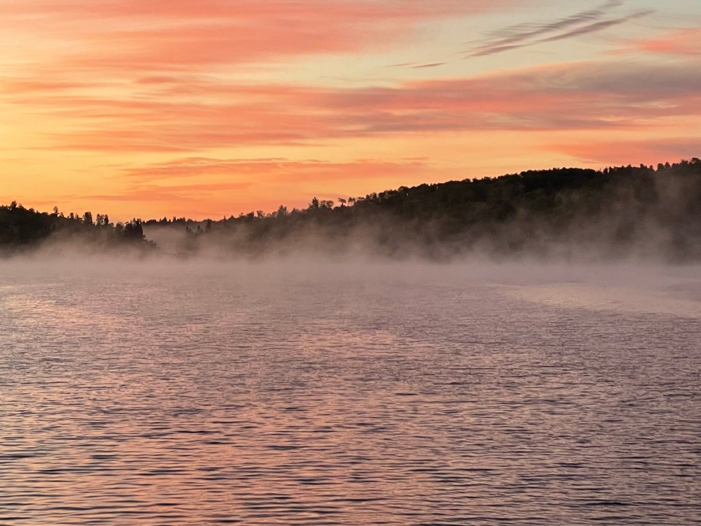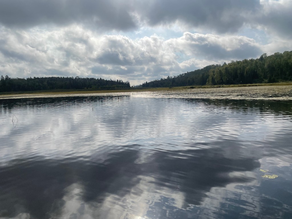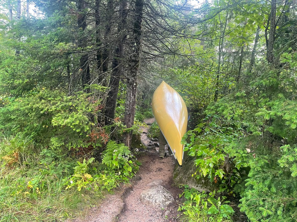 The ending for us is lightened by three playful river otters swimming gracefully. The baby poked its head high out of the water to watch us. Its parents moved it along. We didn’t remember our beginning portage at all. But now it seemed longer than 40 rods.