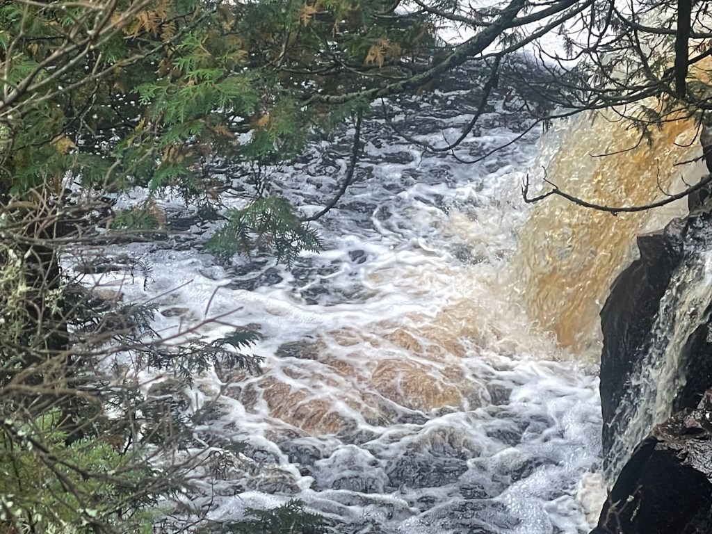 An hour later we reached Elm Portage 65. We could see two guys paddling toward us. And we let them go first. We figured they’d be up and over in one pass. But like us, they had too much stuff and needed to go back and forth three times. One of the guys told me that Elm was the most beautiful falls in the BWCA. To me it looked like Guinness beer flowing over a short drop. I can understand why that might be appealing to some.