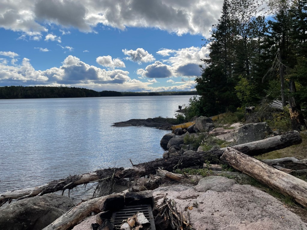 As I said earlier, with no signs or directions, finding a site by looking at the triangle on the map is pure luck. And unlike other areas of the boundary waters, they have fewer beaches for landing. Beaches are easy to spot. Here it’s mostly rocks, and they all stack up the same. Most sites are on a flat rock of various heights. What identities a campsite is a circle of rocks with a grate. We usually need to make one pass by in the canoe before we spot the grate.