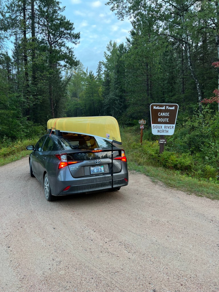 The trip back to the outfitters on the gravel road was slowed by the ill-fit of the canoe on our car. We couldn’t secure it quite right as the Prius has no attachment points. The front strap was holding to the under body tray, and the rear was grabbing the muffler hangar. So we drove slowly and stopped for many small adjustments.
