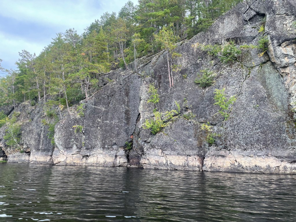 The skies were overcast, but rain didn’t seem imminent. We could enjoy the rest of the day with no other portage looming. Paddling from the Sioux to Loon Lake we saw a Beaver Dam obstructing our passage. We scouted both sides and choose the right to pull he canoe around the edge. Once in Loon Lake, we looked at two camp sites and set up on the second perched high up a rock with a wide view of this big lake. This lake allowed motor boats, and we saw some fishing in the distance.