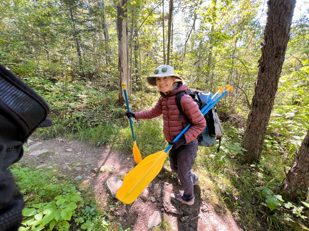 Devil’s Cascade portage 120 was waiting for us. This time there were no other paddlers portaging. But three guys with bright orange beanies and one carrying a gun were walking ahead. Two others startled me coming off a side trail. I gave my typical involuntary cry of surprise. They were very apologetic for frightening me. They disappeared down the trail. I assumed they boarded their canoes and were on their way. But shortly they were heading back. Their five bright orange beanies all in a row, lined up in front of me ready to talk. Once again apologizing. It turned out that the guys wanted to tell me what they were up to.