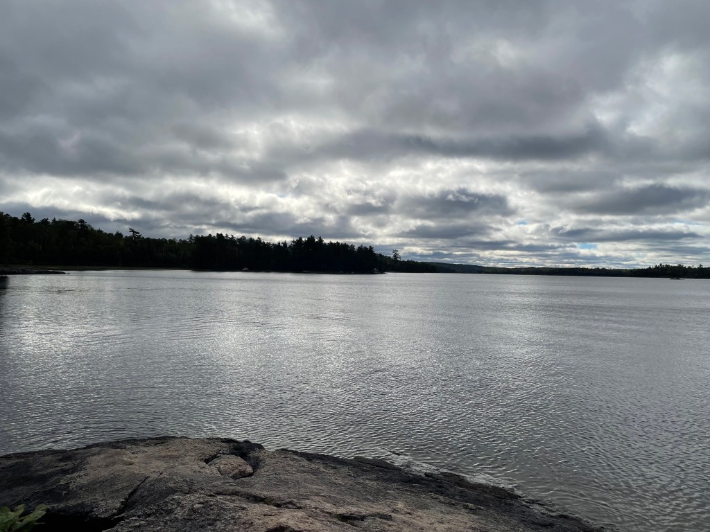 The precarious weather continued, so we hunkered down. We hadn’t seen anyone else, not even a motorboat. Back at camp for the rest of the day, we gathered firewood, and picked up fire starters: birchbark and pitch. By the time Terry came up from casting, the fire was going. He searched for some logs and headed back for more fishing. He came up to tell me he had caught a smallie and he was going to cook on a stick over the fire. With no salt and pepper, no pan, no aluminum paper, he doubted the delectability of this meal. But he found it tasty. We also had Mac and Cheese and a little Fireball to warm us for a cool night.