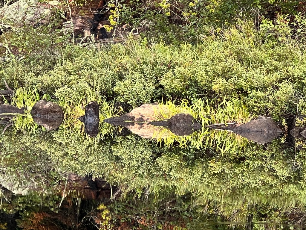 Today we leave everything except a PB&J behind and head for North and South Lakes. We paddle north to our first portage 63 connecting us to Section Pond. So easy sans gear. I feel I need to know the difference between a pond and a lake but I can’t find that out, and why would I? I’m living the pond and the lake.
