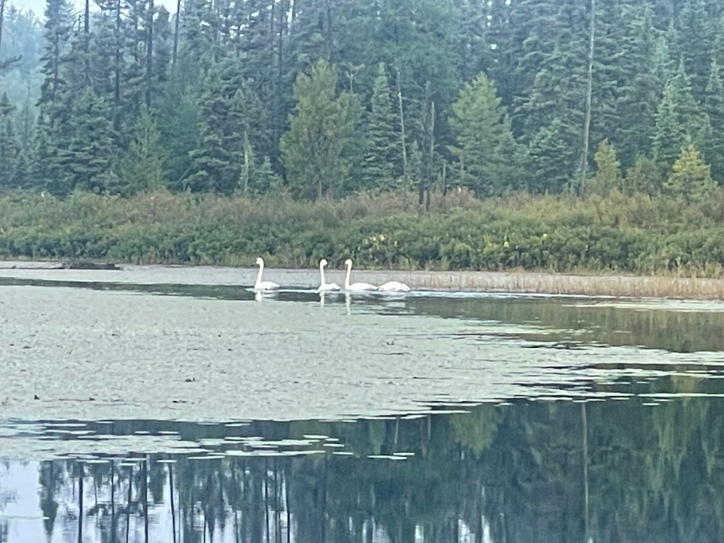 Two trumpeter swans fly over, followed by two more. They land a ways in front of us. One couple twine their necks around each other. And then they all trumpeted a blast that echoed endlessly.