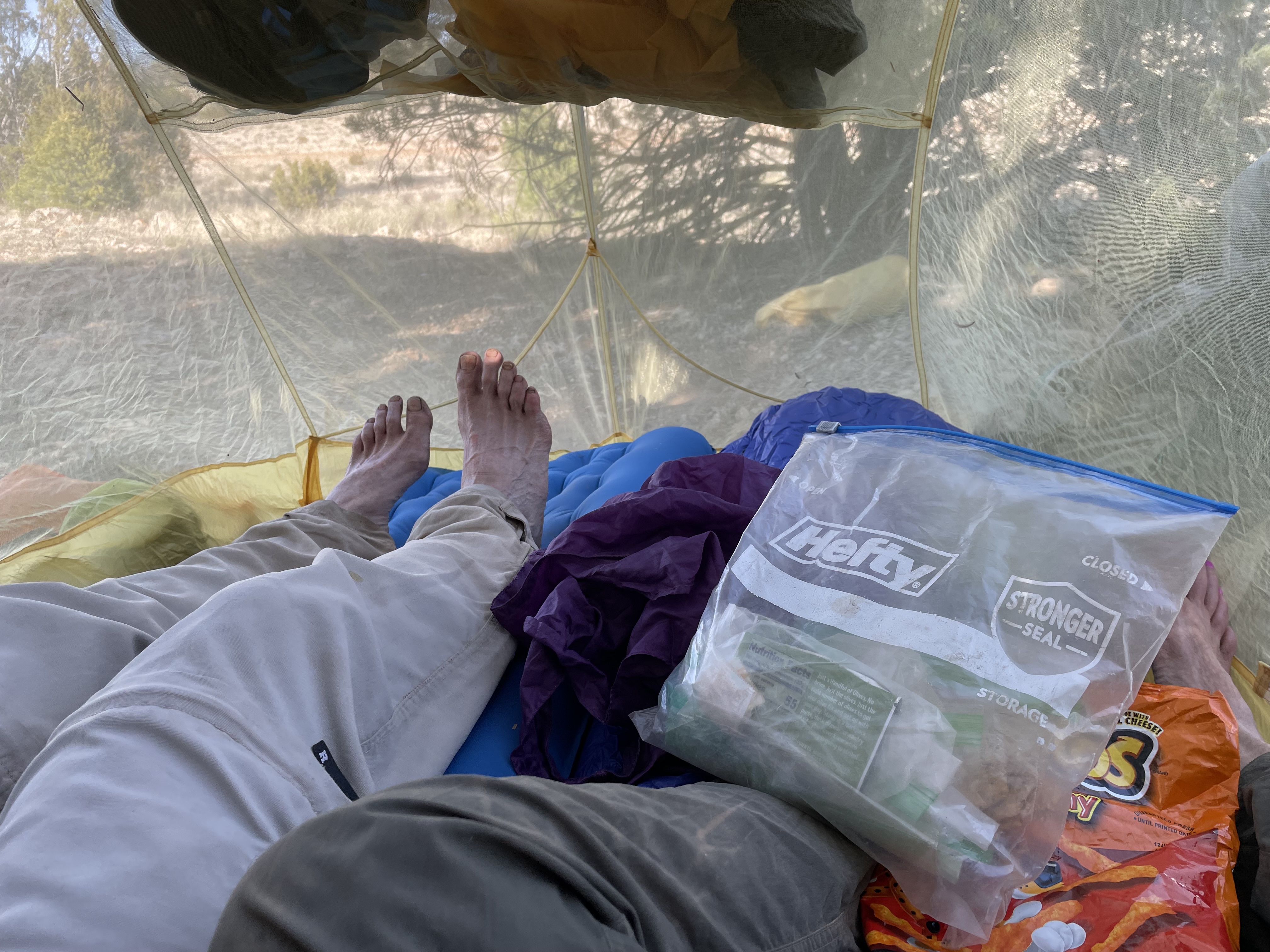Lying on our backs staring at the yellow netting of our tent and talking was so normal but surreal being only 22 miles from Utah, the finish. We talked about the thru-hiking experience. For us it’s a lesson in deprivation, conservation, making do, respecting our surroundings. That’s not really it. That sounds too didactic. This is only about taking a long walk.