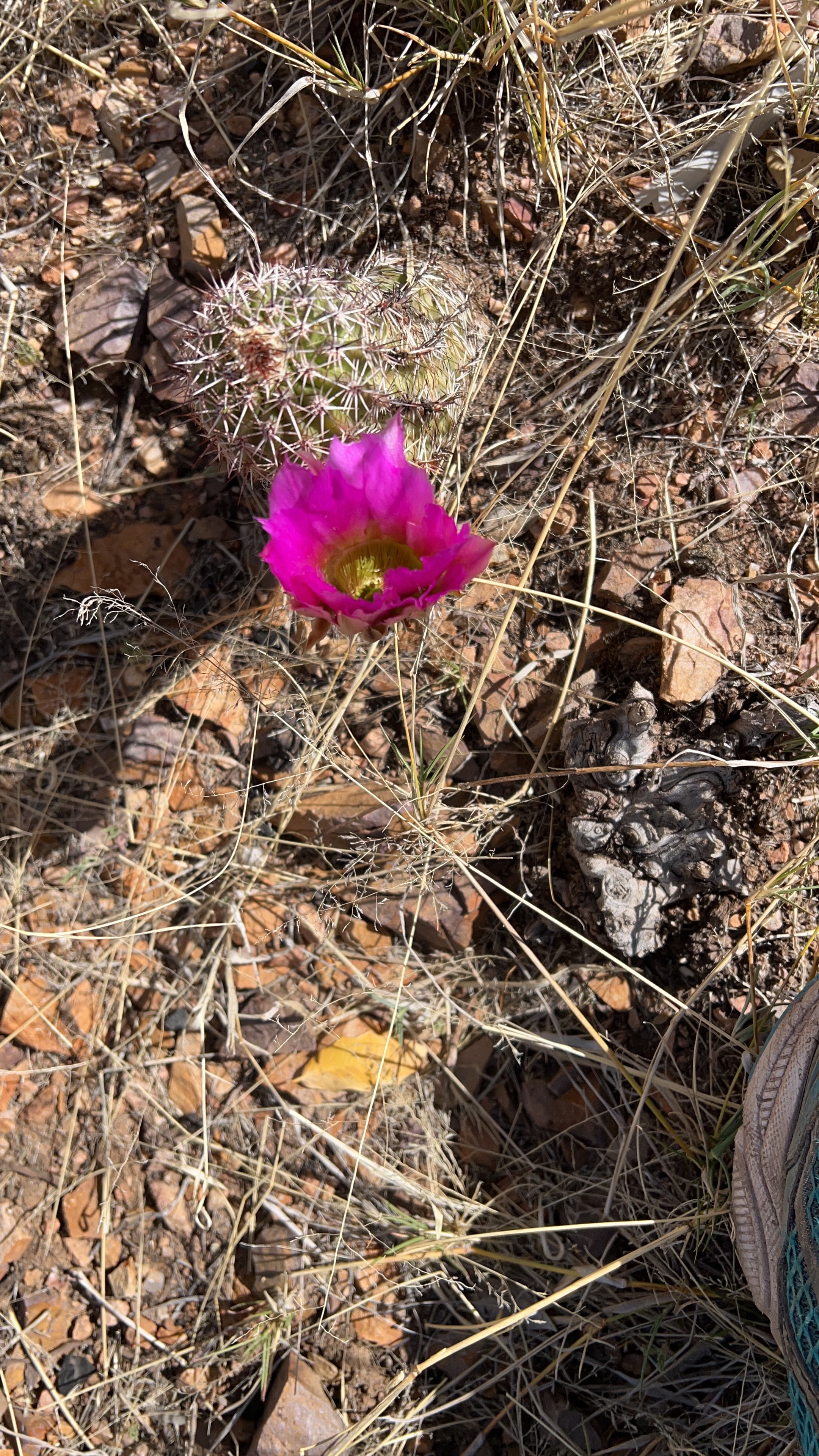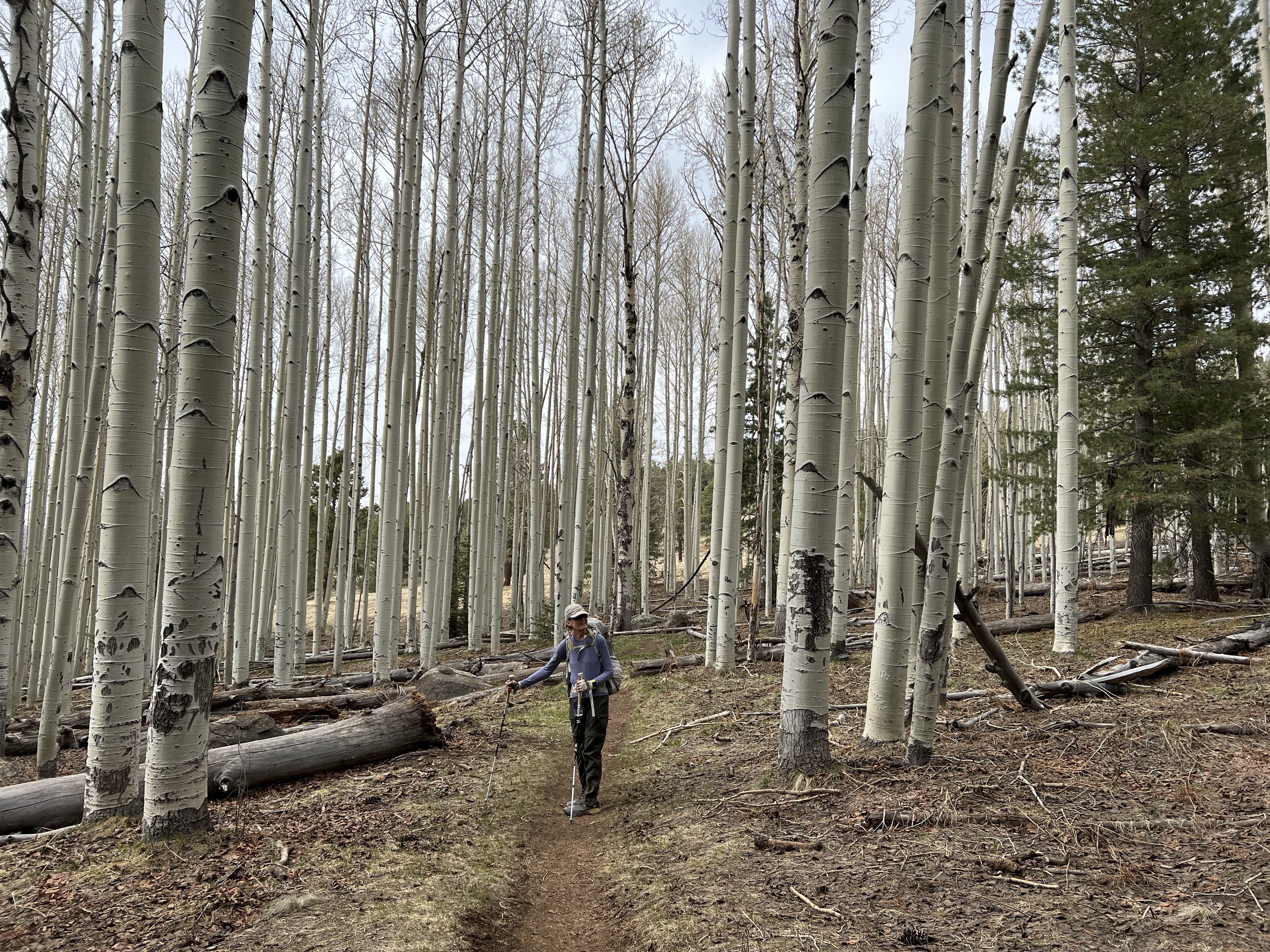 Camped at 8600 ft we were expecting a frosty morning. But the winds blew all night and morning arrived at 40 degrees! Yahoo! A long descent on a smooth trail in the shade of conifers is the stuff of hiking dreams. We left the towering groves of aspen, trading them for pinion and junipers and a few cacti. Flycatchers and pinion jays flitted between them. A helicopter broke the stillness, circling back and forth, searching for what?