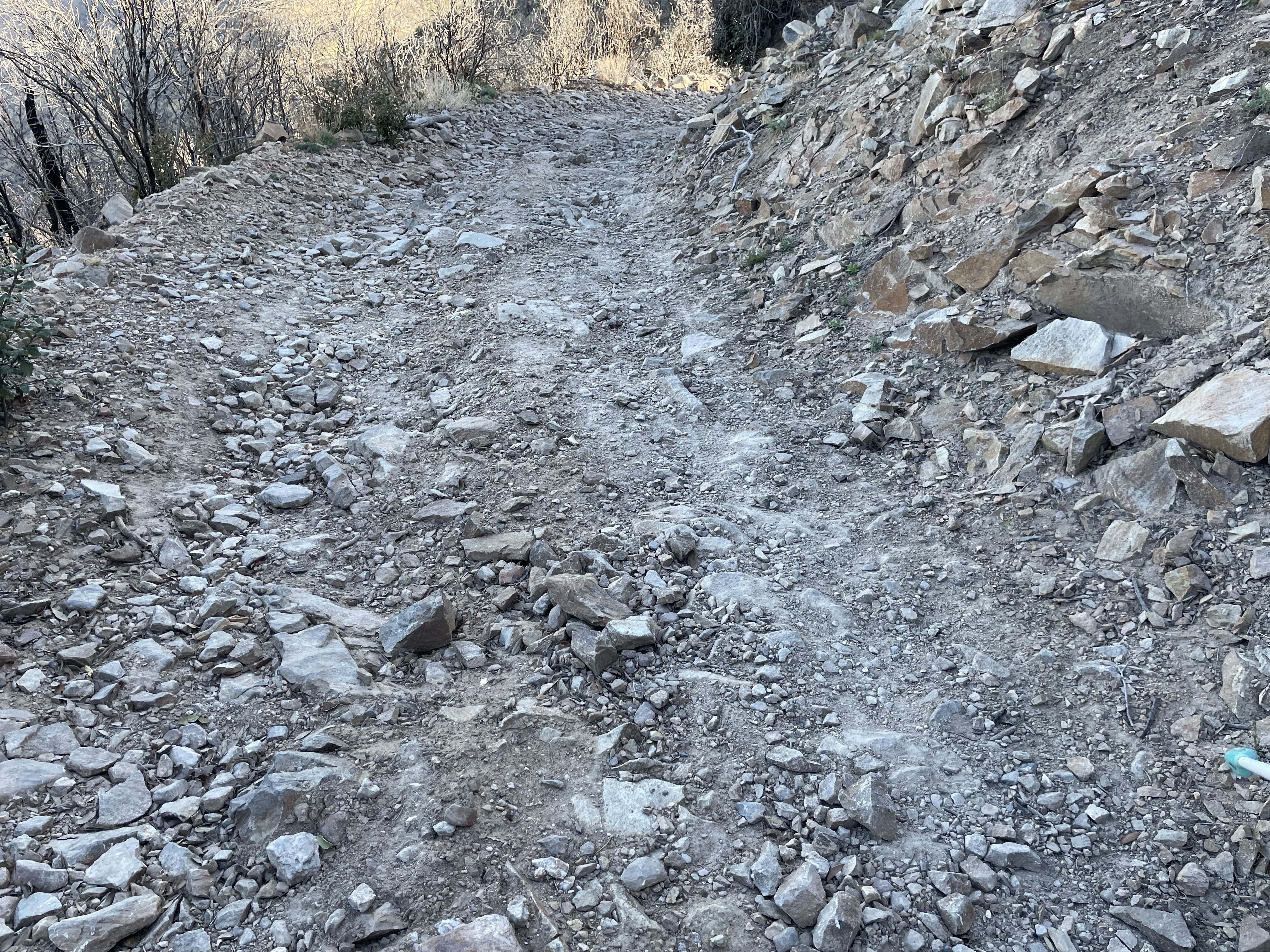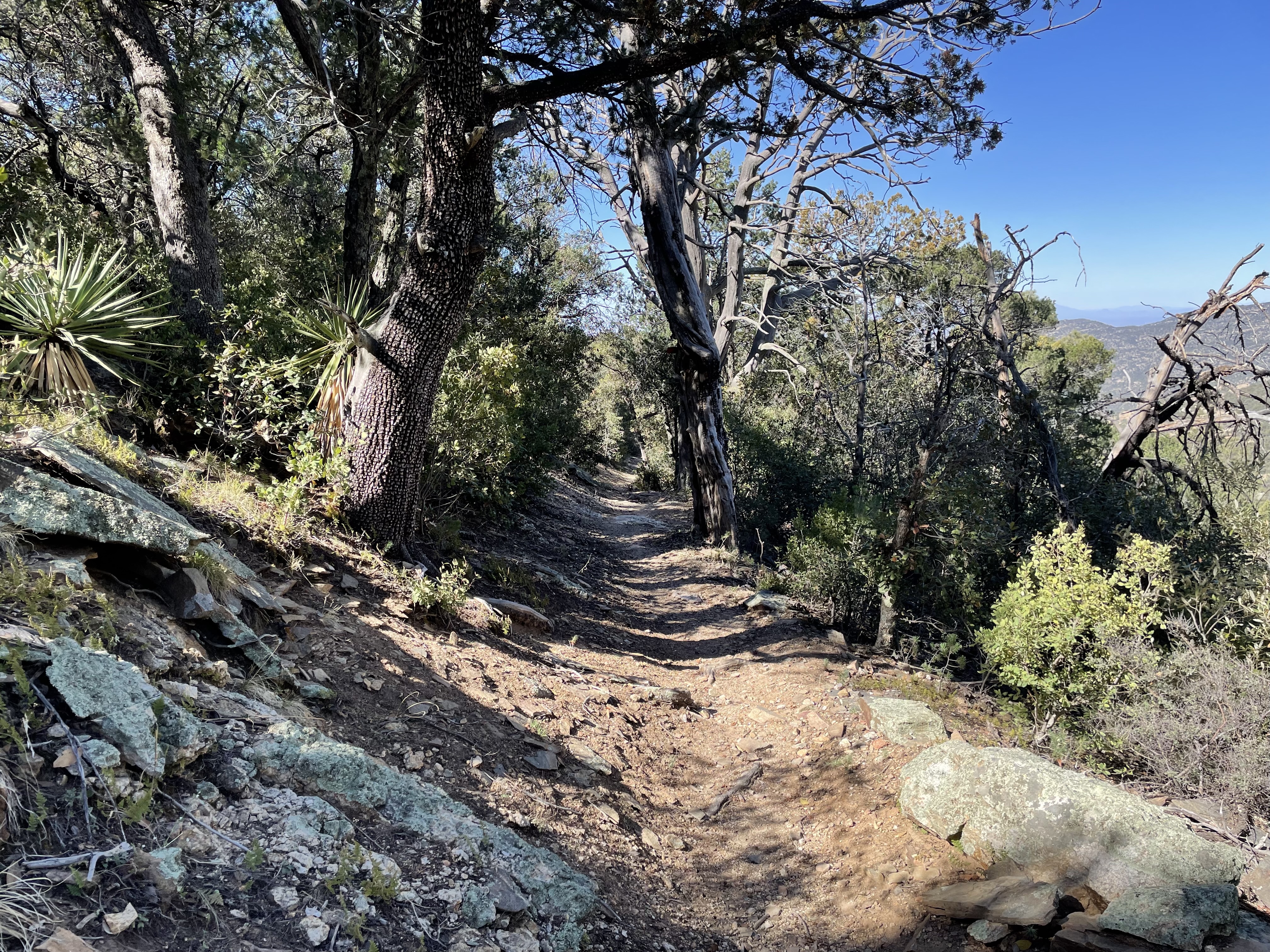 We were happy to start the decent. We flew down hoping to make the progress we needed. If we were going to be in Oracle by Sunday, we needed to get in a fifteen mile day. It seemed possible. Maybe we could do Seventeen miles. And then the trail narrowed until we needed to push through the prickly bramble. Rocks of small bolder size to pea gravel covered the trail tripping us up and sliding us down. No. Falls but lots of slips it was painful, slow and maddening.