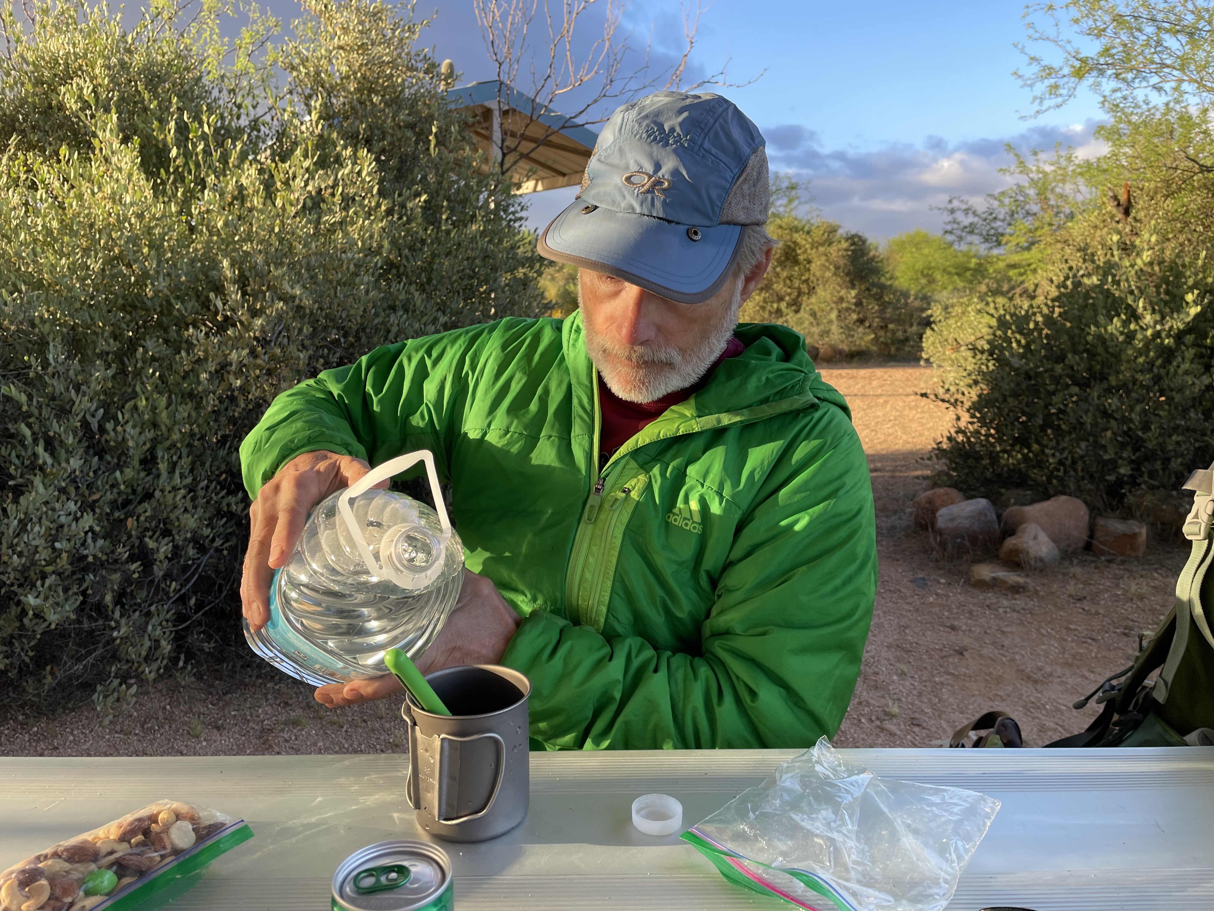 We were well above the saguaro before a few trees started to dot the landscape. I felt I couldn’t take another step. At our last trip to the grocery store last night, I found my favorite pick-me-up, 4 oz cans of double shot espresso. I made room for two of them in my pack. Terry said it was time to use one. After downing one, I, too, skipped up the trail the last three miles. When we got to the camp the other couple and a single man were set up and visiting.