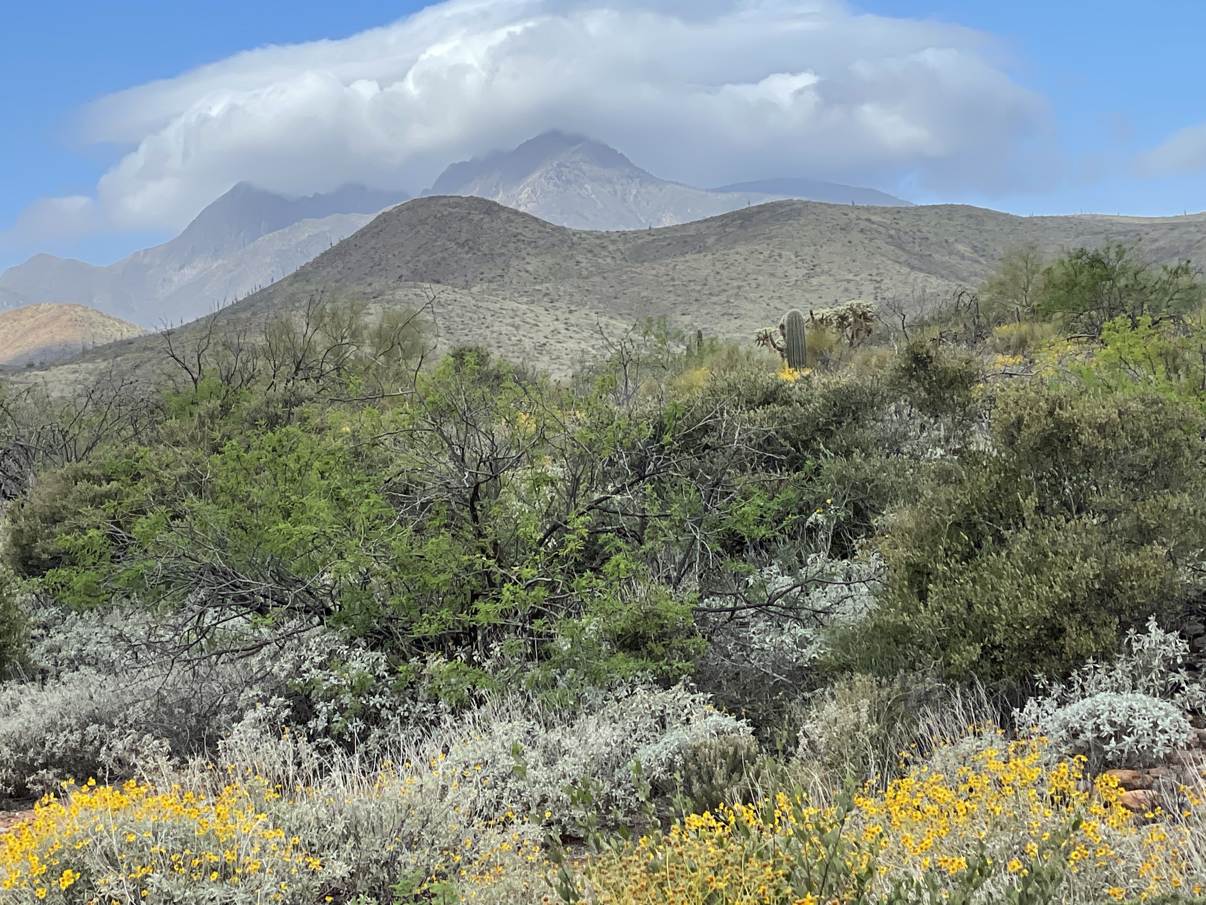 Rocky and treacherous, the north side of Mica was anything but fast and easy. As the morning wore on, the temp rose quickly into the 90’s. Shade was nonexistent. Every animal had crawled or slithered into some hidden pocket of agreeable conditions, except a few miserable hikers. Hey did I mention seeing a long (5-6 ft) green snake laying across the trail a few days ago? When it became aware of our presence, it launched off the trail and up into the branches of a palo verde tree in the blink of eye. It’s eyes showed total focus and I wondered what actions it might be considering.